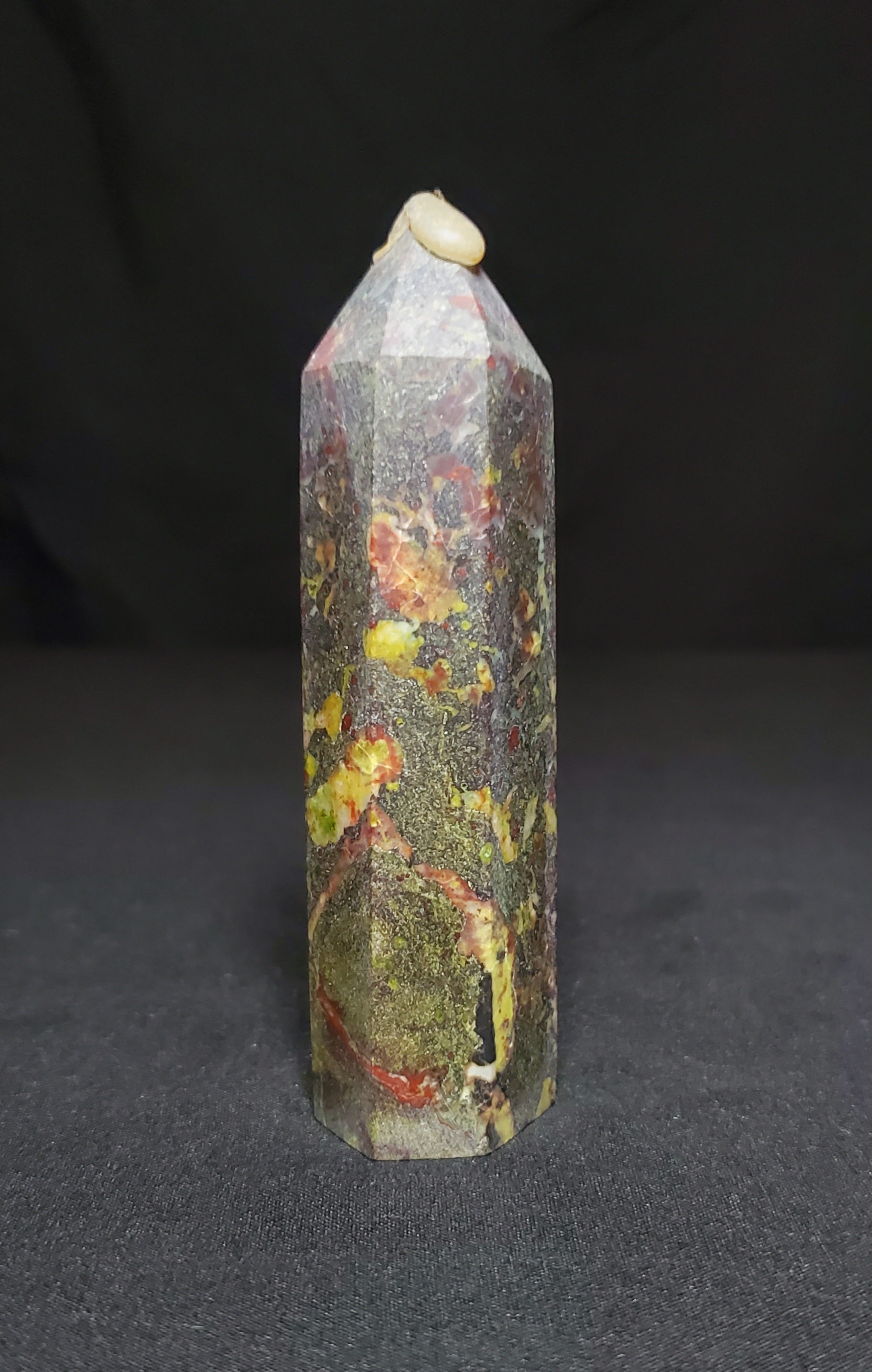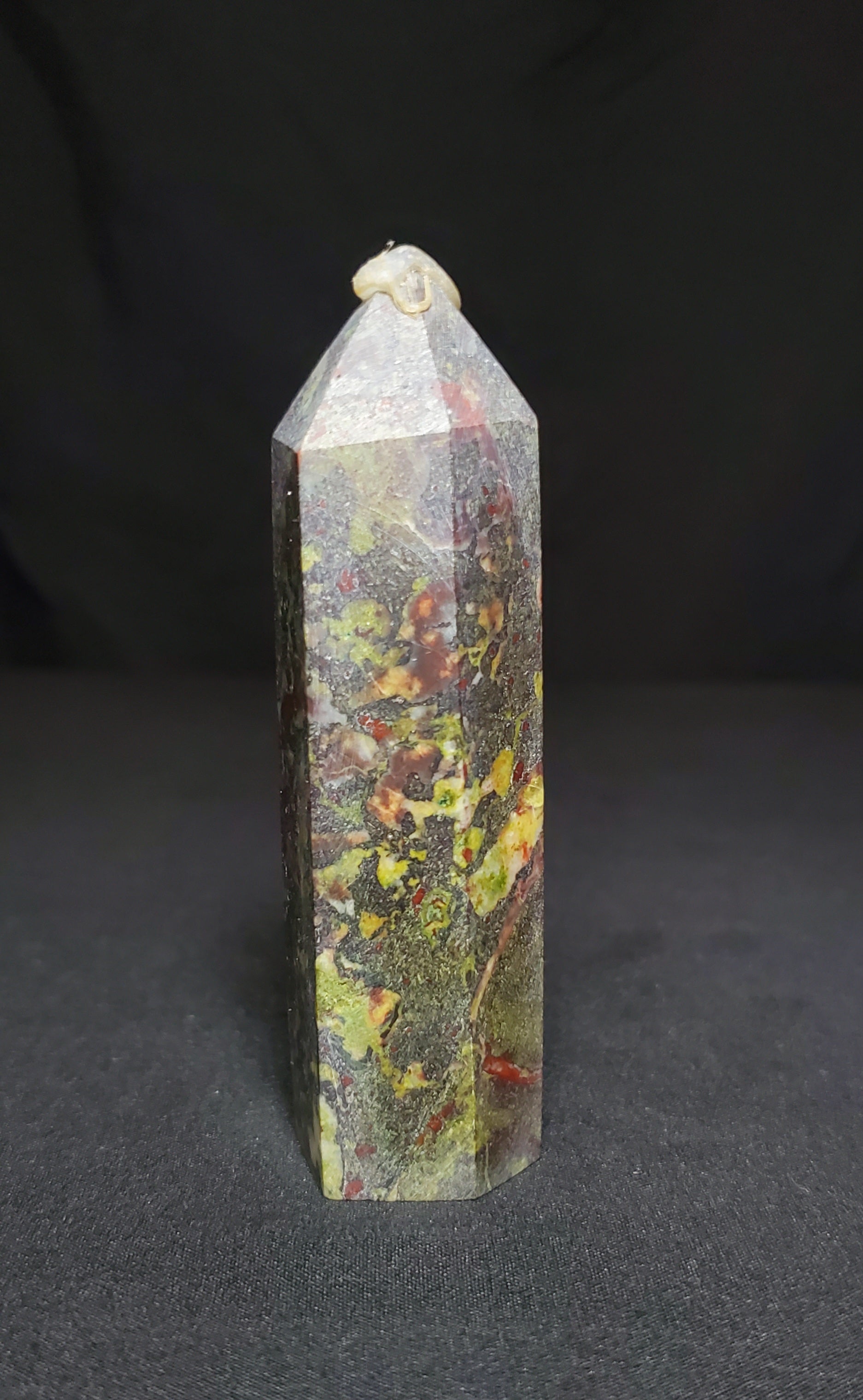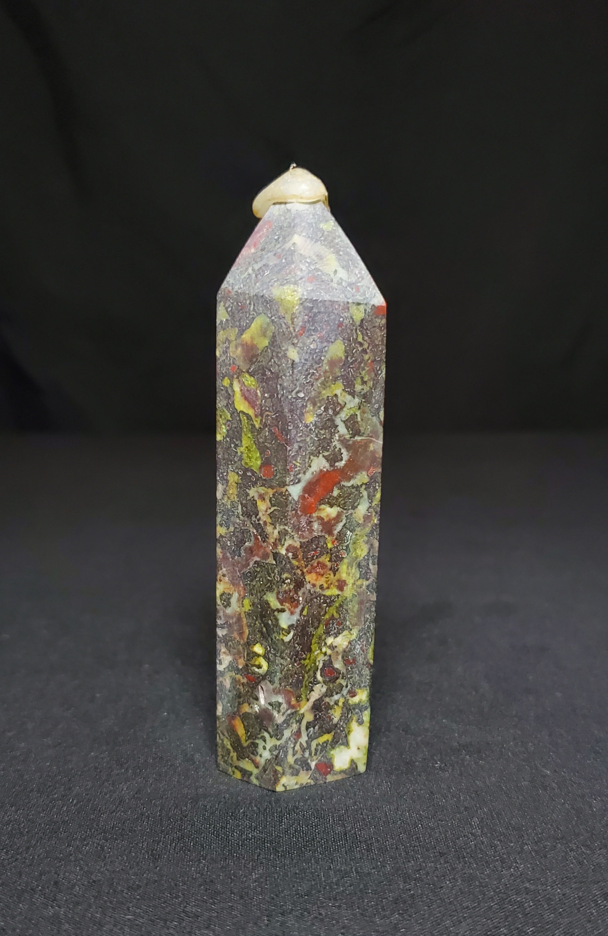 Dragon Bloodstone is said to be a “stone of courage.” It is actually a variety of quartz that displays flecks and veins of red within an opaque green background - It is mined in South Africa. Legend says the stone is the remains of deceased ancient dragons; the green being the skin and the red the blood.