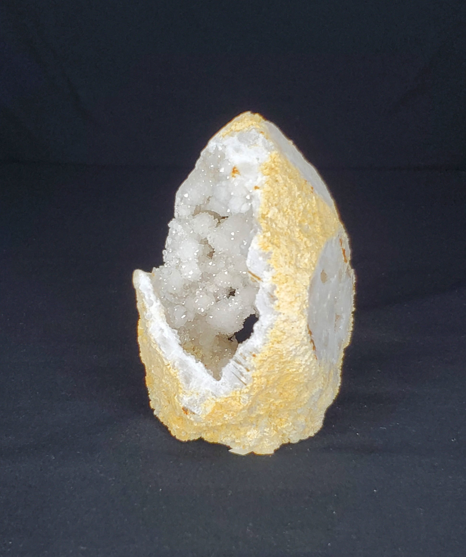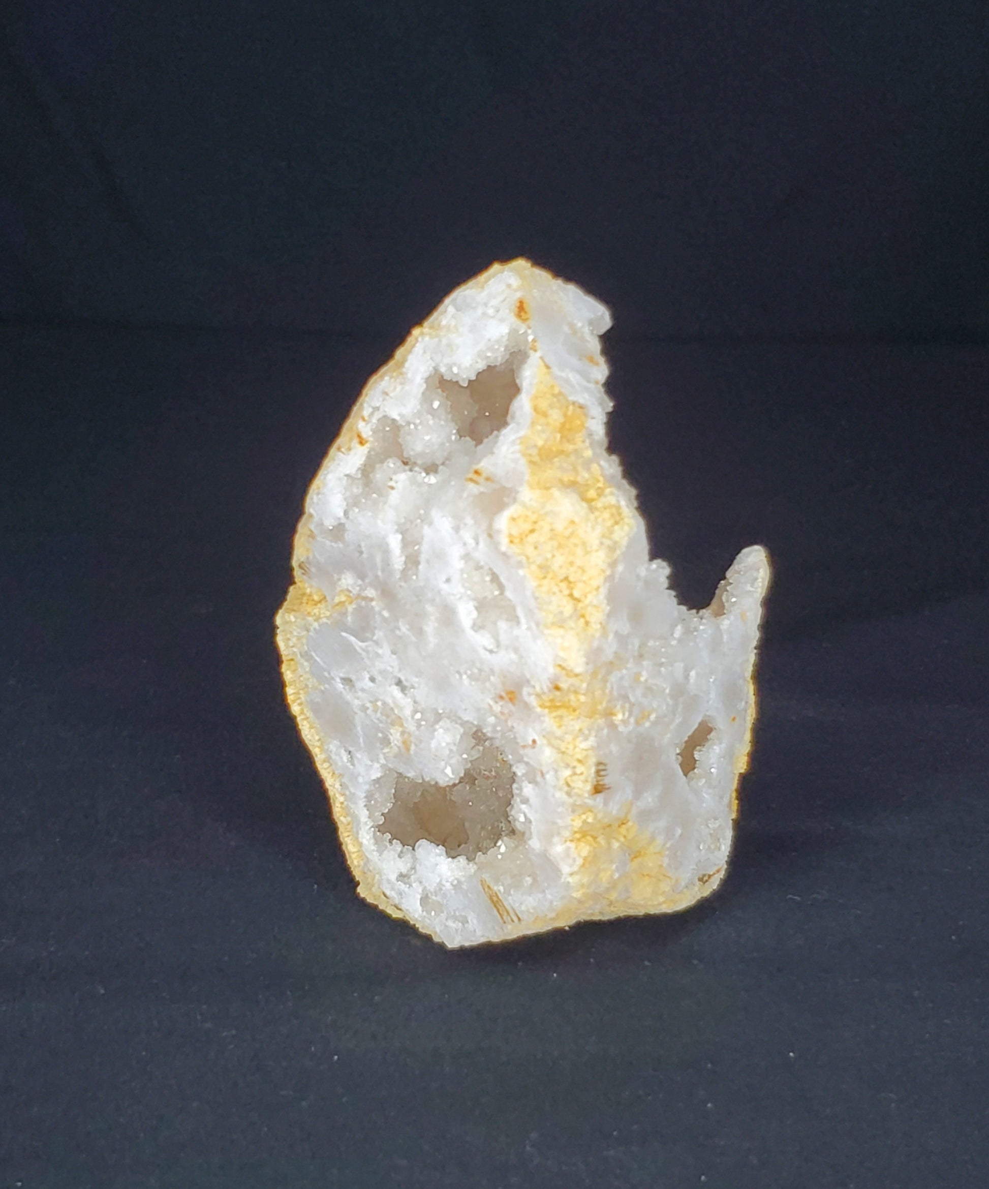 White Moroccan Quartz is mined in the Western Sahara Desert. These beautiful, free-form crystals have been opened to reveal an icy white, milky white, and occasionally transparent interior, lined with rows of beautiful quartz crystals.
